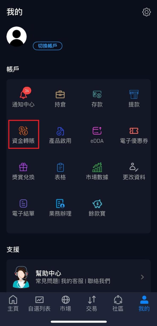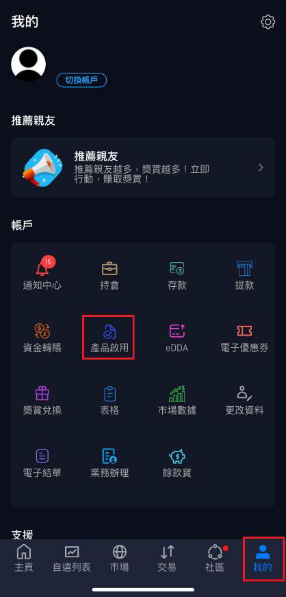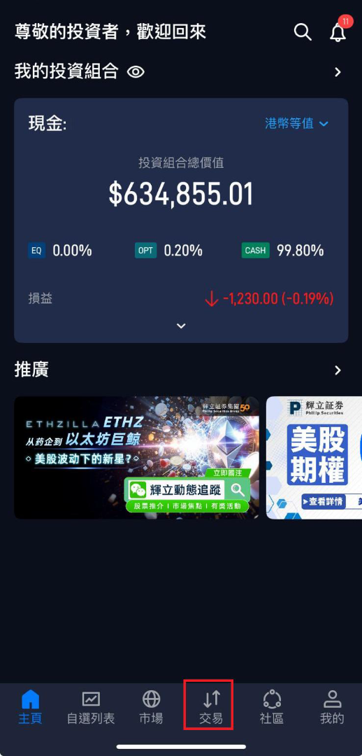 1. 登入 輝立香港 POEMS 手機交易平台,點擊下方 交易。