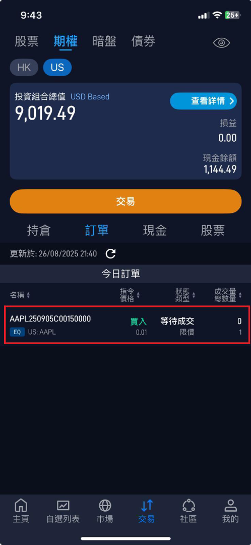 6. 進入相關股票後 → 點擊上方 期權,選擇到期日,於期權鏈選取合約(例:AAPL 150.00 2025-09-05 認購)。