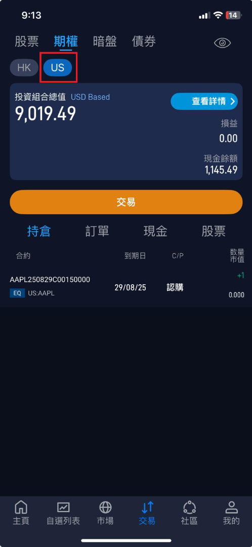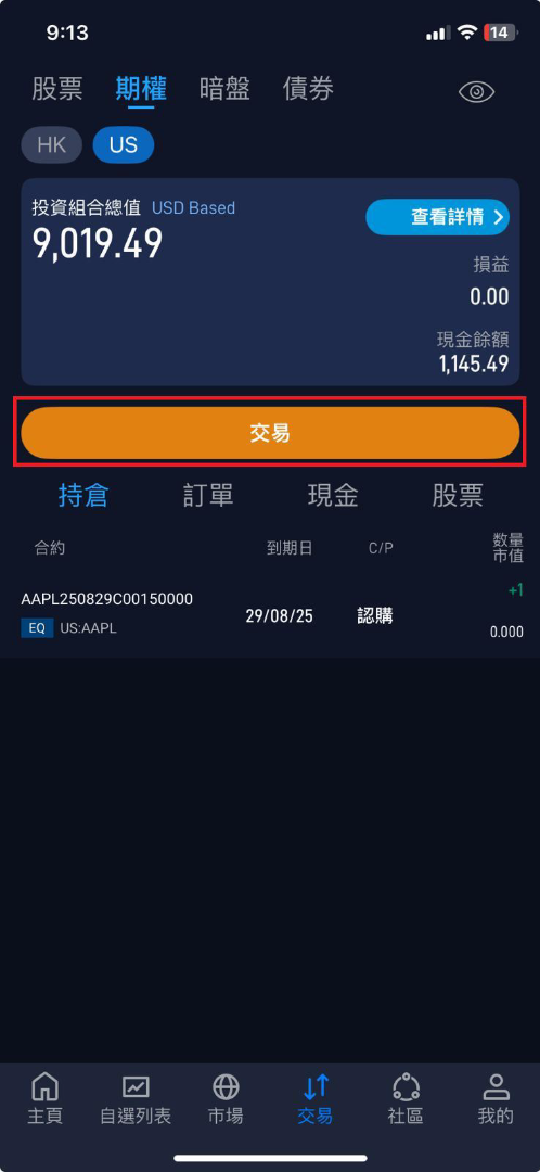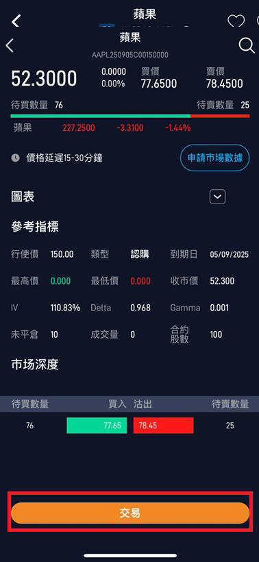 4. 如要交易期權,點擊 交易。